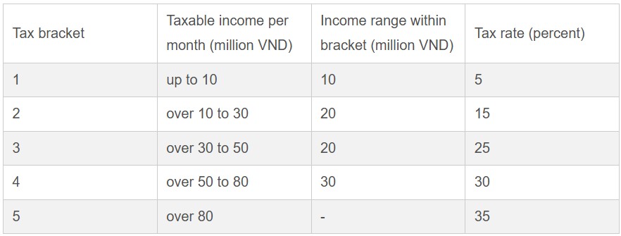 Under the current PIT Law, the progressive tax schedule for income from salaries and wages includes seven brackets: 5 percent, 10 percent, 15 percent, 20 percent, 25 percent, 30 percent, and 35 percent.