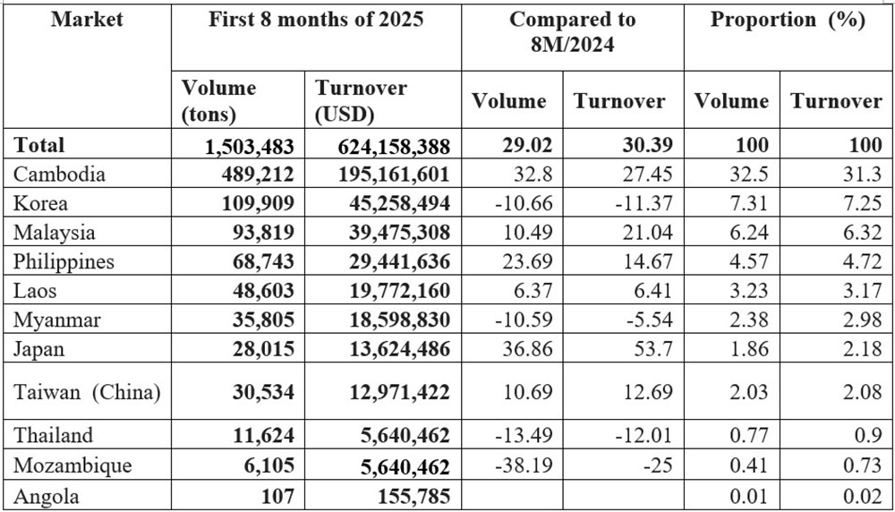 In the first eight months of 2025, Vietnam’s fertilizer exports performed well. The total volume of exports reached over 1.5 million tons, valued at $624.16 million. This represents a significant increase of 29% in volume and 30.4% in value compared to the same period in 2024.