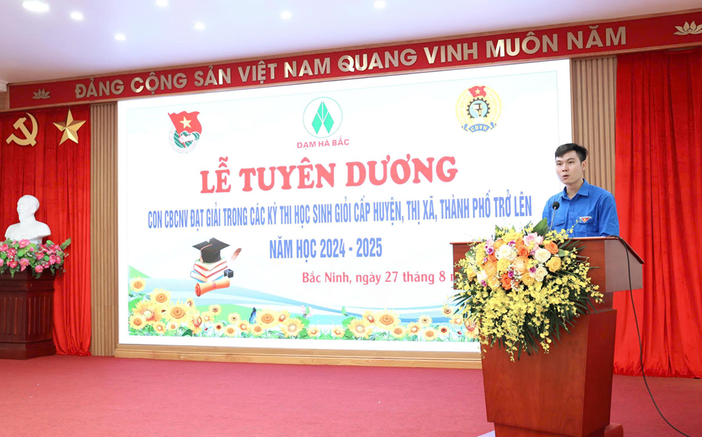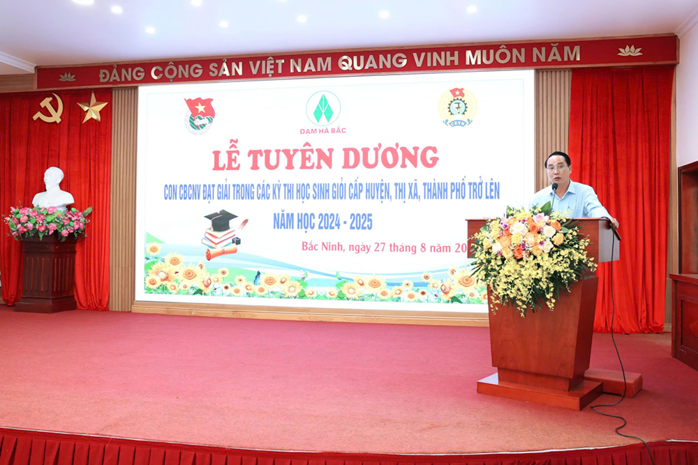 Phát biểu tại hội nghị, đồng chí Nguyễn Văn Dũng - Bí thư Đảng ủy, Tổng Giám đốc Công ty đã biểu dương và chúc mừng các cháu con CBCNV Công ty đạt giải trong các kỳ thi học sinh giỏi cấp huyện, thị xã, thành phố trở lên năm học 2024 - 2025. Việc tuyên dương, khen thưởng con CBCNV không chỉ là sự ghi nhận thành tích học tập, mà còn là lời tri ân đối với những người lao động đã và đang ngày đêm cống hiến cho Công ty. Đây là sự tiếp nối giữa các thế hệ - từ cha mẹ đến con cái - để truyền thống hiếu học, tinh thần vượt khó và niềm tự hào Đạm Hà Bắc luôn được gìn giữ và phát huy. Mong rằng các cháu sẽ tiếp tục nuôi dưỡng ước mơ, không ngừng phấn đấu, rèn luyện phẩm chất đạo đức, trau dồi tri thức để mai này trưởng thành, trở thành những công dân có ích, góp phần xây dựng quê hương, đất nước.