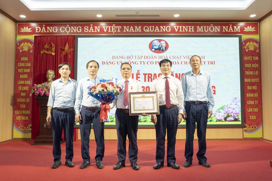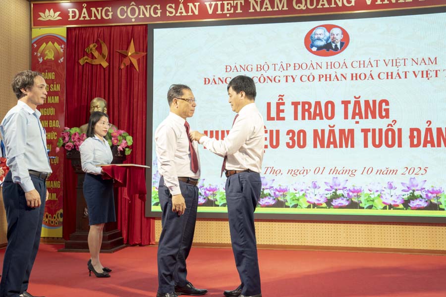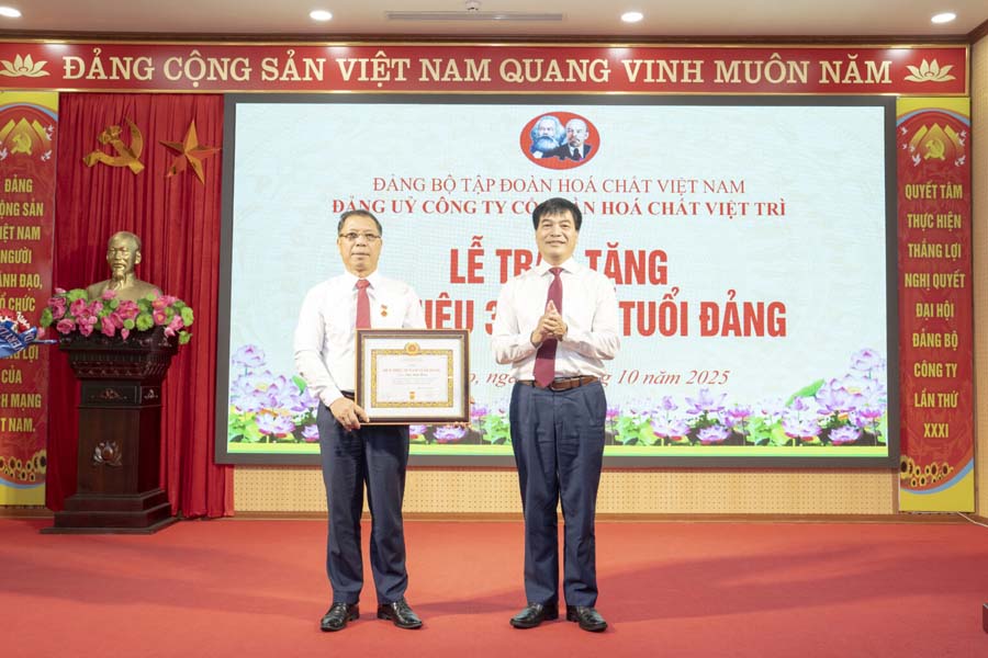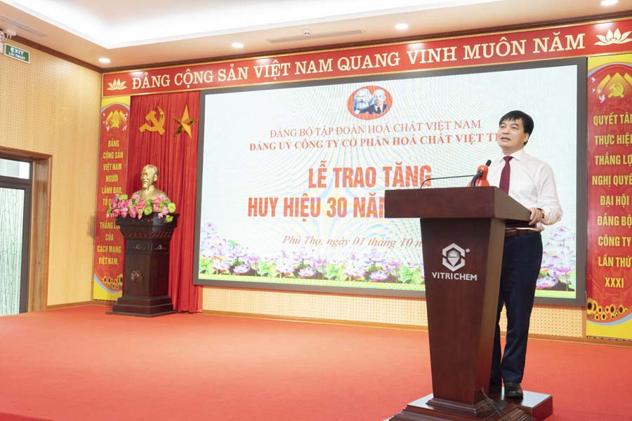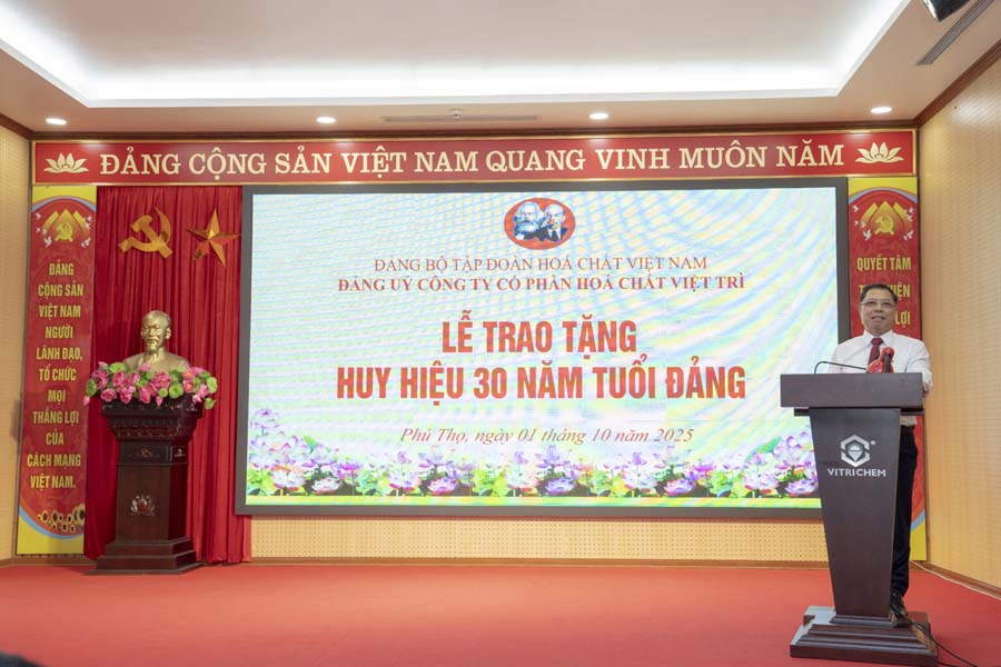 Ngày 01/10/2025, Đảng ủy Công ty Cổ phần Hóa chất Việt Trì long trọng tổ chức Lễ trao tặng Huy hiệu 30 năm tuổi Đảng cho đồng chí Văn Đình Hoan – Bí thư Đảng ủy, Tổng Giám đốc Công ty. Buổi Lễ diễn ra trong không khí trang nghiêm, ấm áp, thể hiện sự trân trọng của tập thể cán bộ, đảng viên, người lao động Công ty đối với những cống hiến to lớn của Đồng chí trong suốt quá trình rèn luyện, phấn đấu và trưởng thành trong Đảng.