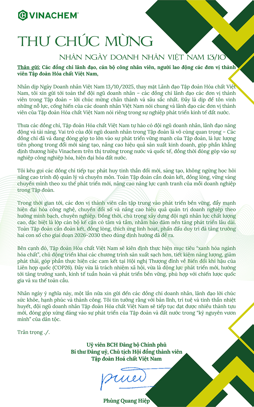 Nhân Ngày Doanh nhân Việt Nam 13/10, đồng chí Phùng Quang Hiệp – Bí thư Đảng ủy, Chủ tịch Hội đồng thành viên Tập đoàn Hóa chất Việt Nam đã gửi Thư chúc mừng tới toàn thể cán bộ, đảng viên và người lao động Tập đoàn Hóa chất Việt Nam.