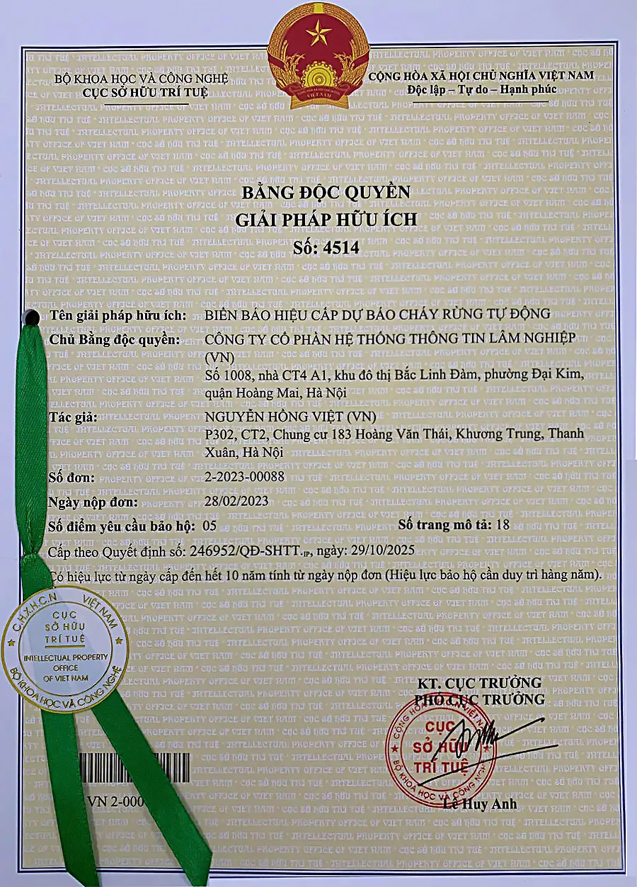 Biển báo hiệu cấp dự báo cháy rừng tự động được Công ty Cổ phần Hệ thống Thông tin Lâm Nghiệp nghiên cứu, sản xuất và đưa vào sử dụng từ năm 2018, nhằm khắc phục các nhược điểm của biển báo hiệu thủ công dùng trước đây như tốn thời gian, công sức, không đảm bảo tính kịp thời thông tin cấp dự báo cháy rừng.